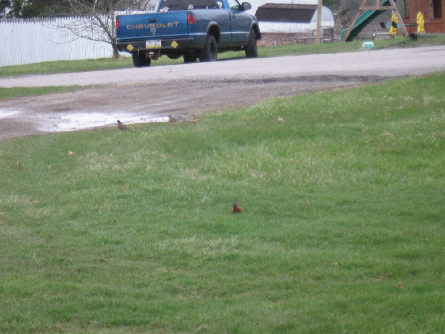Spring is here. If the photo didn’t get cropped in your browser, you can see a couple of robins heading for the puddles in the driveway. The puddles were formed by melting snow yesterday. The robins were headed for a final drink before the puddles completely disappeared. We call that area of the backyard the ‘birdbath.’