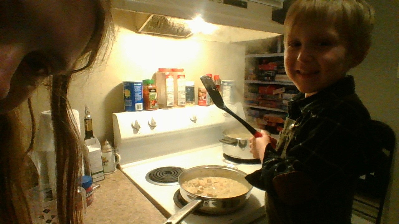 My son created a monster. The next day, the four-year-old reported to the kitchen to cook the evening meal again. My son let him sauté the chicken, again with Dad, our son, doing the measuring. He would have done more, but he had to take his nap. Our son says that he is interested in learning. Our grandson thinks that the Iron Chef better watch out.