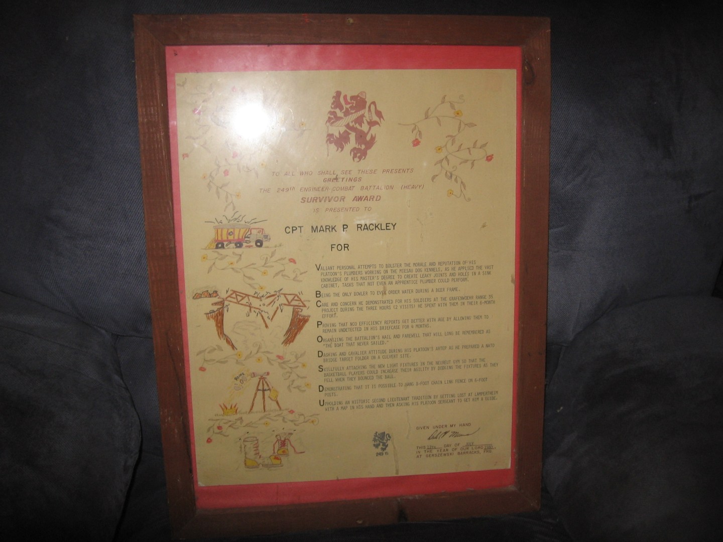 But after reading the ARCOM citation is when everything totally fell apart. Since I had not been to the Hail and Farewell, my farewell, my immediate boss, who I had worked for as the Facilities Engineer, doing all the stuff mentioned above, and who had moved on to be the battalion commander of the battalion that I was just leaving… I know, it was confusing, working fulltime in a military community role while attached to a military unit, with two sets of bosses. No, my best boss ever who presented the second award, who worked for the other best boss ever who just presented the first award, got up and read my battalion survivor award – all the mistakes I had made as a newbie lieutenant. The opposite of the accomplishments for which I had just received a medal.